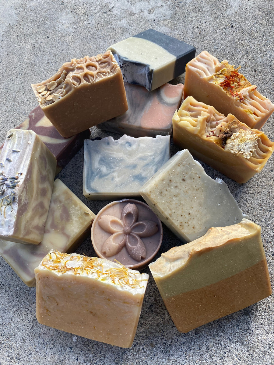 We make a selection of completely natural soaps made with all natural colorings such as spinach powder, indigo, French green clay, annatto seeds just to mention a few. These soaps are special formulas that are made for very sensitive skin. Scented with essential oils.